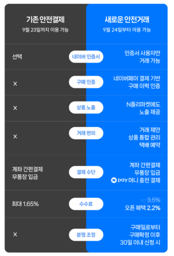기존의 안전결제 시스템과 새로운 안전거래 시스템은 여러 가지 차이점이 있습니다. 기존 시스템은 네이버 인증서와 구매 인증을 통해 거래를 진행했지만, 새로운 시스템은 보다 강화된 사용자 인증과 거래 관리 기능을 제공합니다. 또한, 수수료 구조도 변경되어 기존 결제는 최대 1.65%의 수수료가 부과되었으나, 새로운 거래는 최대 3.5%의 수수료가 적용됩니다. 이러한 변화는 사용자들에게 더 많은 혜택을 제공하기 위한 것입니다.