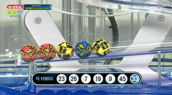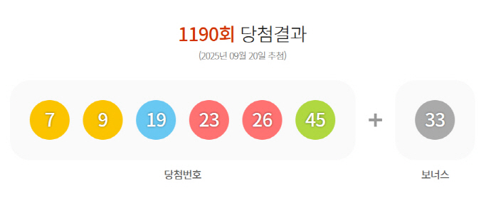 이번 제 1190회 로또의 당첨 번호는 다음과 같습니다: 7, 9, 19, 23, 26, 45 . 보너스 번호는 33 입니다.