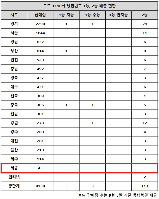 로또 제 1190회 당첨 번호 및 판매점 정보