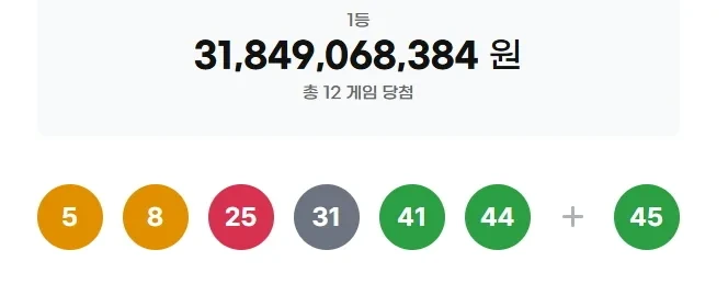 이번 로또 1212회의 당첨번호는 다음과 같습니다: 5, 8, 25, 31, 41, 44 입니다. 보너스 번호는 45 입니다.