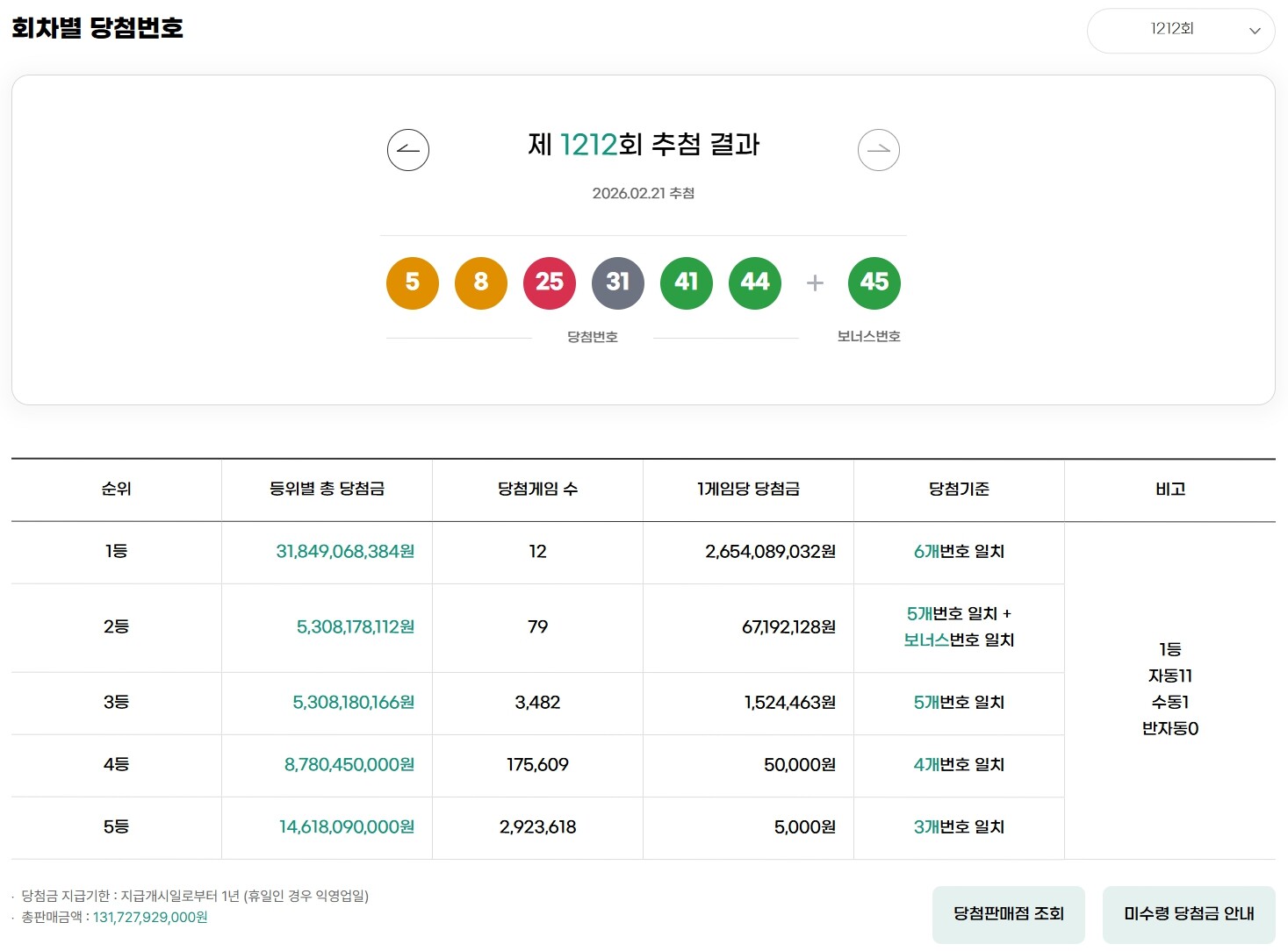 이번 1212회 로또에서 1등에 당첨된 분들은 총 12명 이며, 각자 26억 5,408만 9032원 을 수령하게 됩니다. 총 당첨금은 318억 4,906만 384원 으로, 정말 어마어마한 금액입니다!