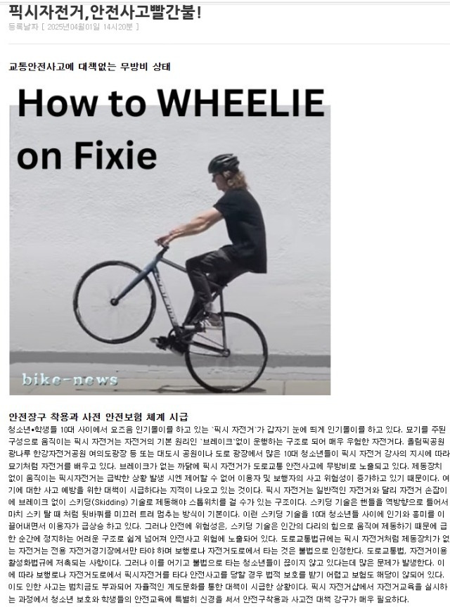 [4] 네이트 - 제동장치 없는 '픽시자전거' 사망 사건…경찰, 칼 빼든다 (https://news.nate.com/view/20250817n05765)