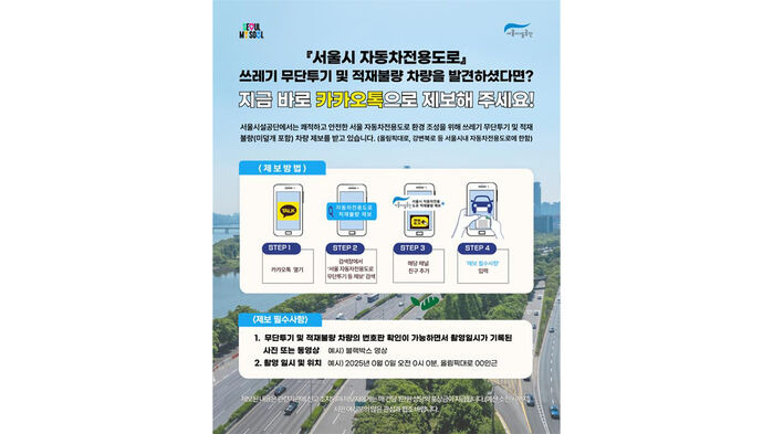 서울에서는 무단투기를 신고하기 위한 간편한 방법을 제공하고 있습니다. 카카오톡을 통해 '서울 자동차전용도로 무단투기 등 제보' 채널을 추가한 후, 다음과 같은 절차를 따르면 됩니다: