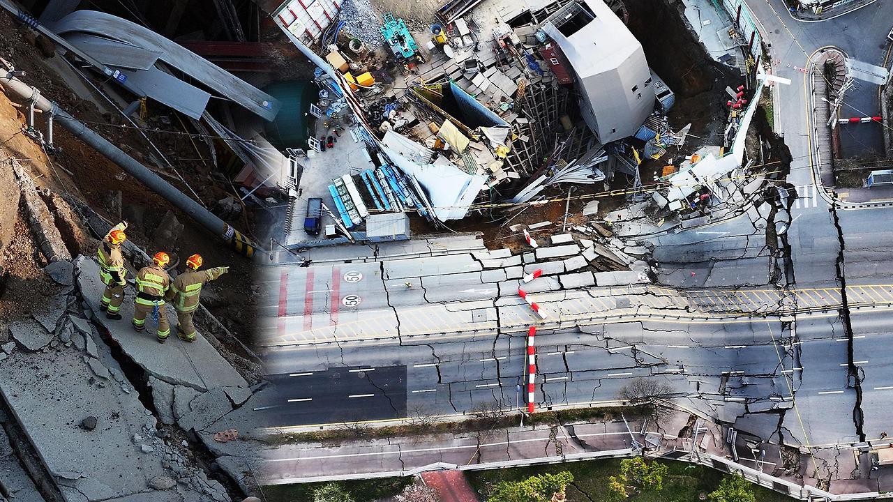 이 사진은 사고가 발생한 도로의 상태를 보여줍니다. 도로는 크고 작은 균열로 가득 차 있으며, 인근의 건물과 공사 현장도 심각한 피해를 입었습니다.