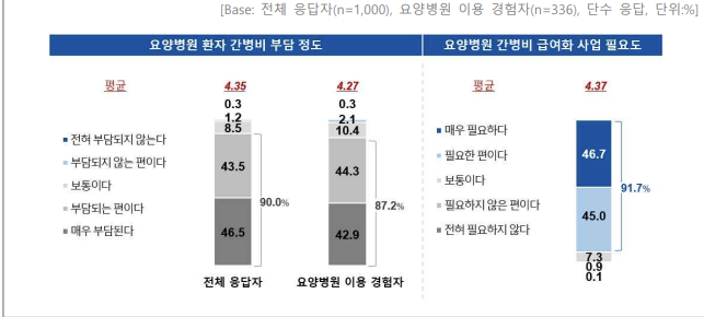 최근 조사에 따르면, 요양병원 간병비에 대한 부담을 느끼는 국민의 비율이 매우 높습니다. 조사에 참여한 1,000명 중 336명이 요양병원 서비스를 이용한 경험이 있으며, 이들 중 상당수가 간병비 지원이 필요하다고 응답했습니다.