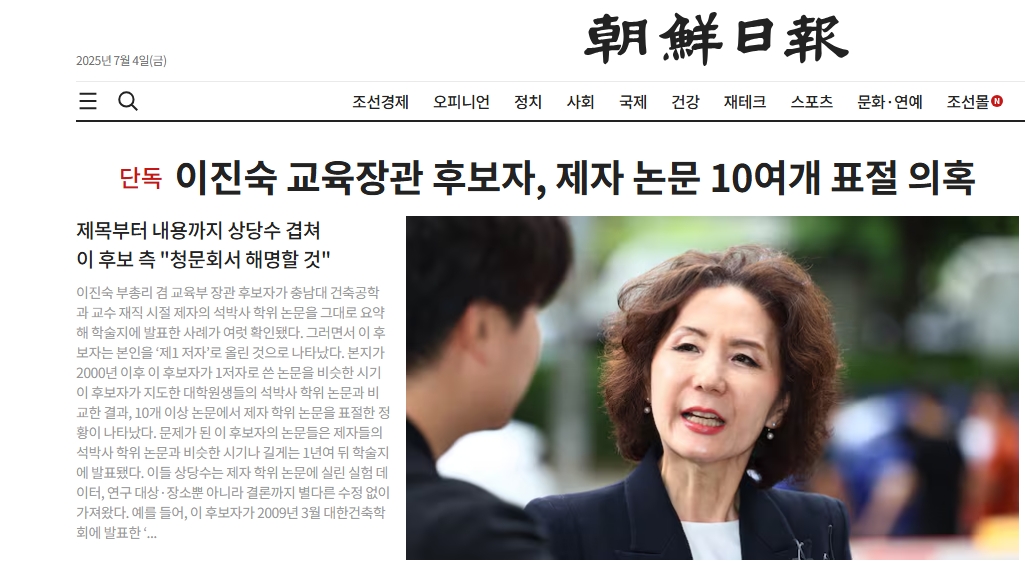 [1] 중앙일보 - 이진숙 후보자, 논문 중복 게재 의혹…실험 설계·결론 '판박이' (https://www.joongang.co.kr/article/25348912)