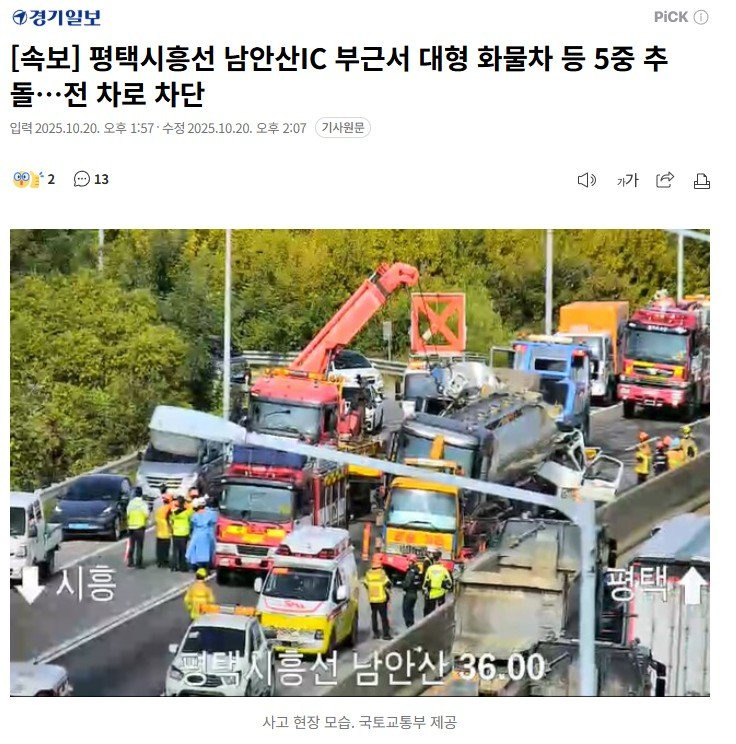 [1] Daum - [속보] 평택시흥선 남안산IC 부근서 대형 화물차 등 5중 추돌 ... (https://v.daum.net/v/20251020135655246)
