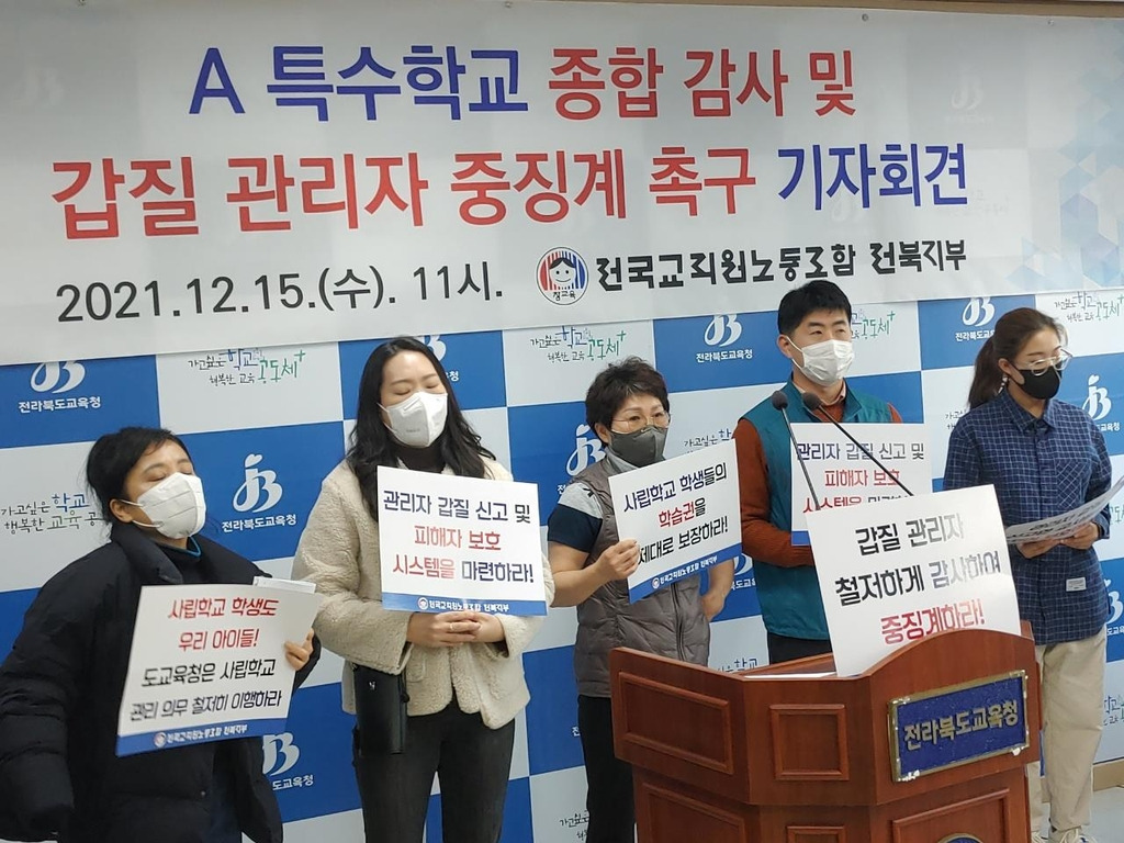 [3] 전민일보 - “더 이상 침묵하지 않겠다”…전북 A특수학교 관리자 갑질 ... (http://jeonmin.co.kr/news/articleView.html?idxno=423491)