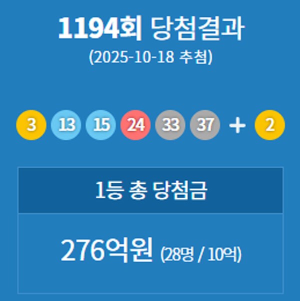 [4] 경향신문 - 1194회 로또 1등은 '3, 13, 15, 24, 33, 37'··· 당첨자 28명 9 ... (https://www.khan.co.kr/article/202510182203001)