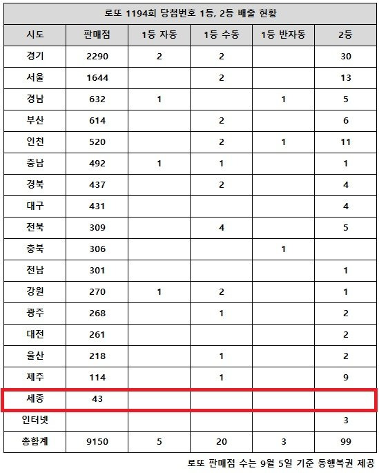 지역별 판매 현황 로또 판매는 전국적으로 이루어지며, 각 지역별로 당첨자 수가 다르게 나타났습니다. 예를 들어, 세종시는 43개의 판매점이 있었지만 1등 당첨자는 없고, 2등 당첨자는 3명이 나왔습니다. 전체적으로 9,150개의 판매점에서 5명의 1등 당첨자와 20명의 2등 당첨자가 나왔습니다.