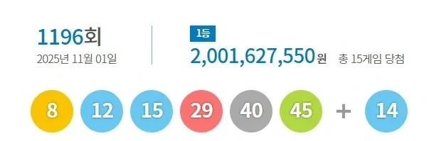 2025년 11월 1일에 진행된 제 1196회 로또의 당첨 번호는 8, 12, 15, 29, 40, 45 이며, 보너스 번호는 14 입니다.