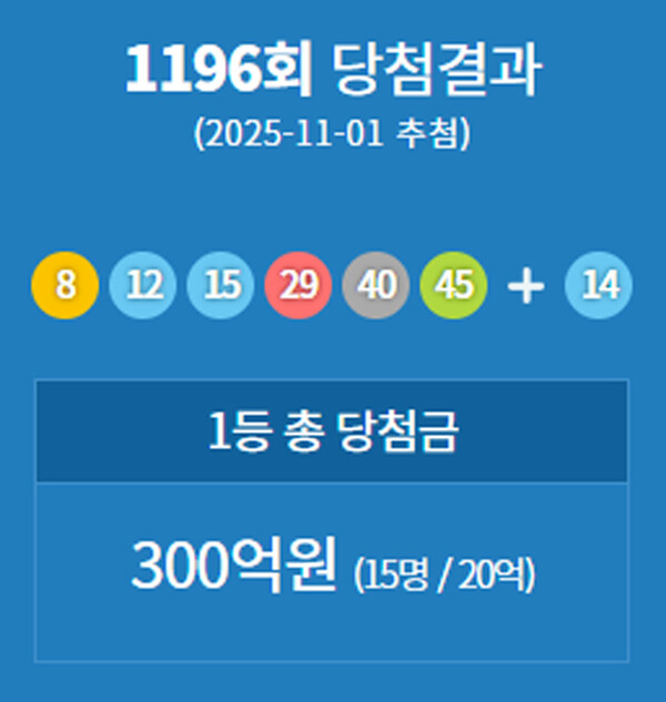 [3] 연합뉴스 - 1196회 로또 1등 15명…당첨금 각 20억원(종합) (https://www.yna.co.kr/view/AKR20251101057400002)