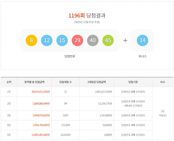 [2] 데일리안 - 1196회 로또 1등 당첨번호 '8·12·15·29·40·45'... ... (https://dailian.co.kr/news/view/1567373)