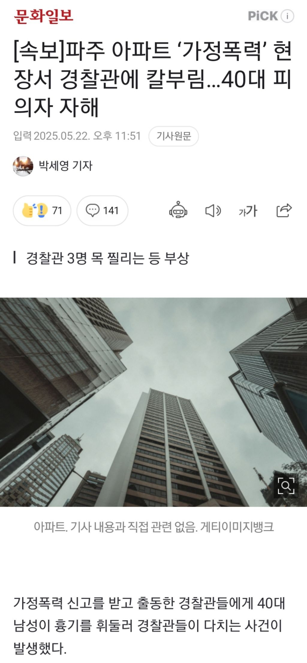 [1] 연합뉴스 - [2보] 파주 사건 현장서 칼부림…경찰관 등 4명 부상 (https://www.yna.co.kr/view/AKR20250522158151060)