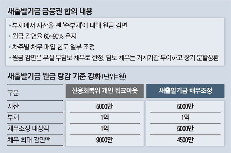 부채 탕감 프로그램의 세부 사항과 기준은 다음과 같습니다. 자영업자들은 특정 자산 기준과 총 부채 금액에 따라 지원을 받을 수 있습니다. 예를 들어, 월 소득이 중위소득의 60% 이하인 자영업자들이 우선적으로 지원 대상이 됩니다.