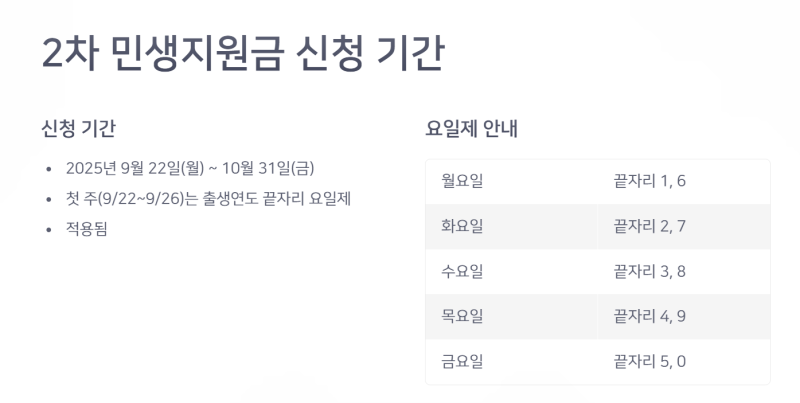 신청은 2025년 9월 22일부터 10월 31일까지 진행됩니다. 첫 주인 9월 22일부터 26일까지는 특정 날짜에 따라 신청이 가능하니, 개인의 일정에 맞춰 신청하시기 바랍니다. 신청 방법은 온라인과 오프라인 모두 가능하며, 온라인 신청의 경우 정부의 공식 웹사이트를 통해 진행됩니다.