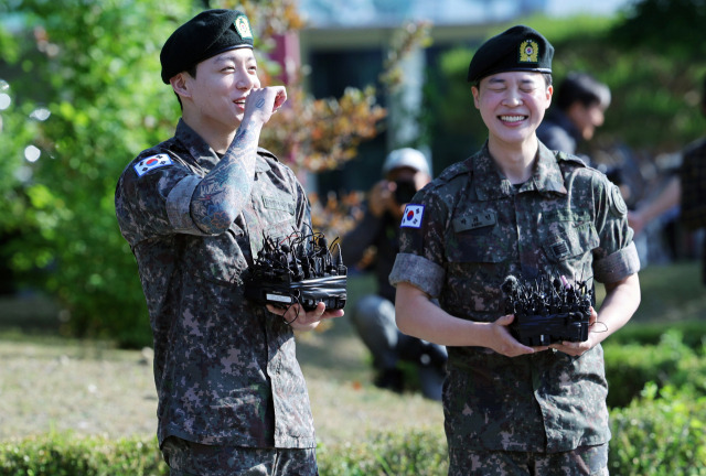 정국의 전역을 축하하는 팬들의 모습입니다. 그들의 기쁨이 전해집니다.